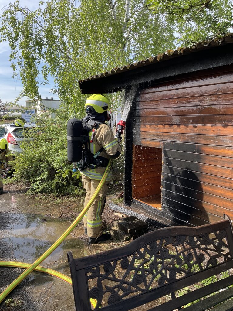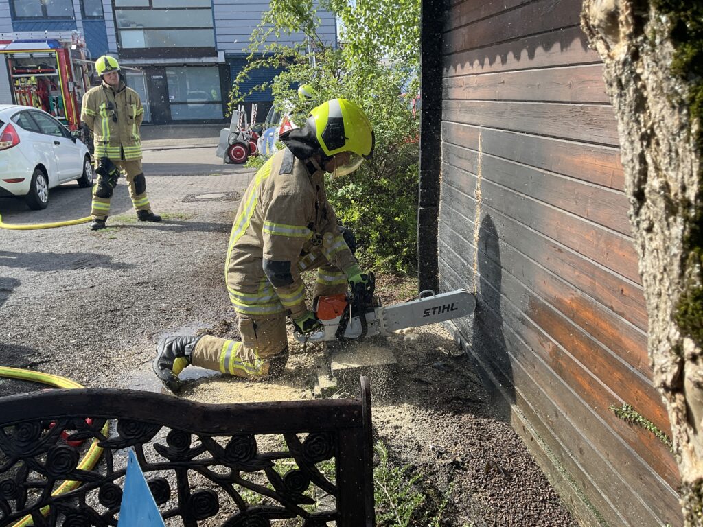 Beim Eintreffen an der Einsatzstelle stellte sich heraus, dass Gartenabfälle bzw. ähnliches brennbares Material in unmittelbarer Nähe zu einer Gartenhütte in Brand geraten war. Ein Trupp unter Atemschutz bekämpfte das Feuer zügig mit einem C-Rohr und kühlte die betroffene Außenwand. Der Innenraum der Hütte wurde kontrolliert und überhitzte Holzverkleidungen mit der Rettungssäge entfernt. Abschließend wurde der Bereich mit der Wärmebildkamera auf Glutnester überprüft.