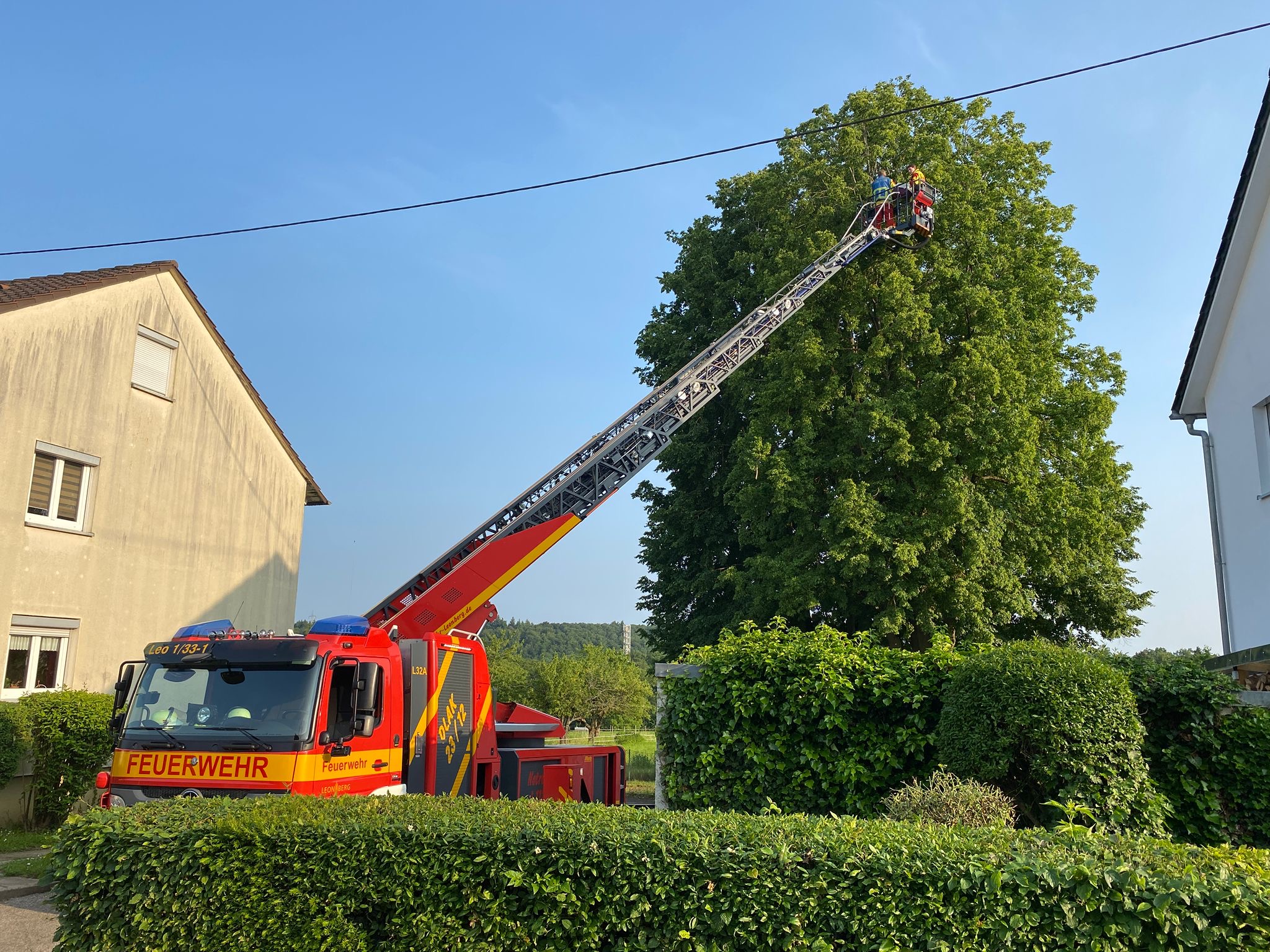 Da die Katze mit tragbaren Steckleitern nicht zu erreichen war, wurde die Drehleiter der Feuerwehr Leonberg nachgefordert.