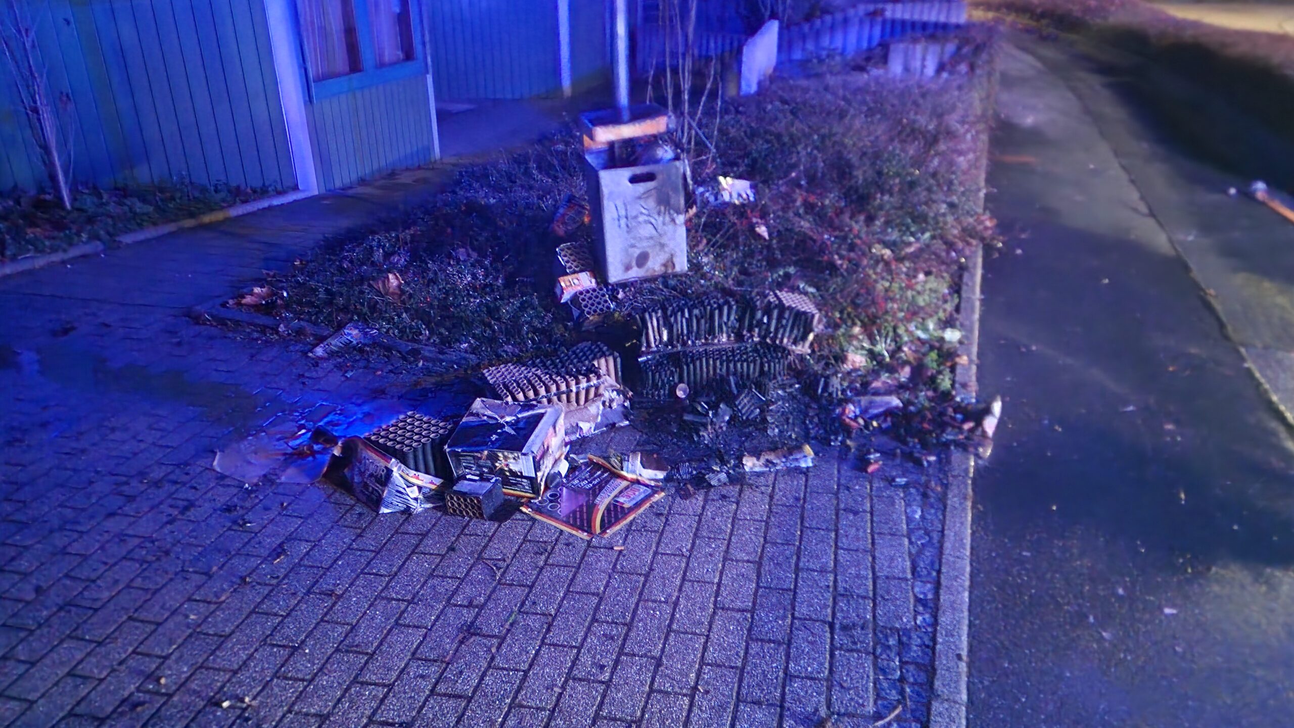 Anwohner hatten Reste eines Feuerwerks am Mülleimer gesammelt. Dabei geriet der Haufen in Brand. Dieser wurde mittels eines C-Rohrs abgelöscht und der Bereich abschließend mit der Wärmebildkamera kontrolliert.