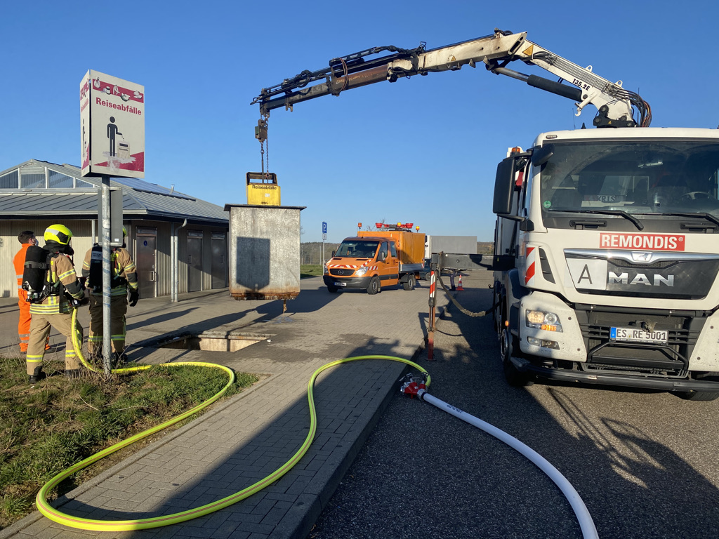 Vor Ort konnte aus dem unterirdischen Müllsystem eine starke Rauchentwicklung festgestellt werden. Der Behälter wurde mit Wasser geflutet. Mithilfe der Autobahnmeisterei wurde das System mittels Kran aus dem Boden gezogen, der Behälter vor Ort ausgeleert und die Glutreste abgelöscht. Die Autobahnmeisterei sammelte anschließend den Müll wieder auf und entsorgte diesen dann. Die Kräfte der Feuerwehr Leonberg musste hierbei nicht eingreifen, füllten aber den Wassertank des Rutesheimer Löschfahrzeugs vor abrücken einmal komplett auf.