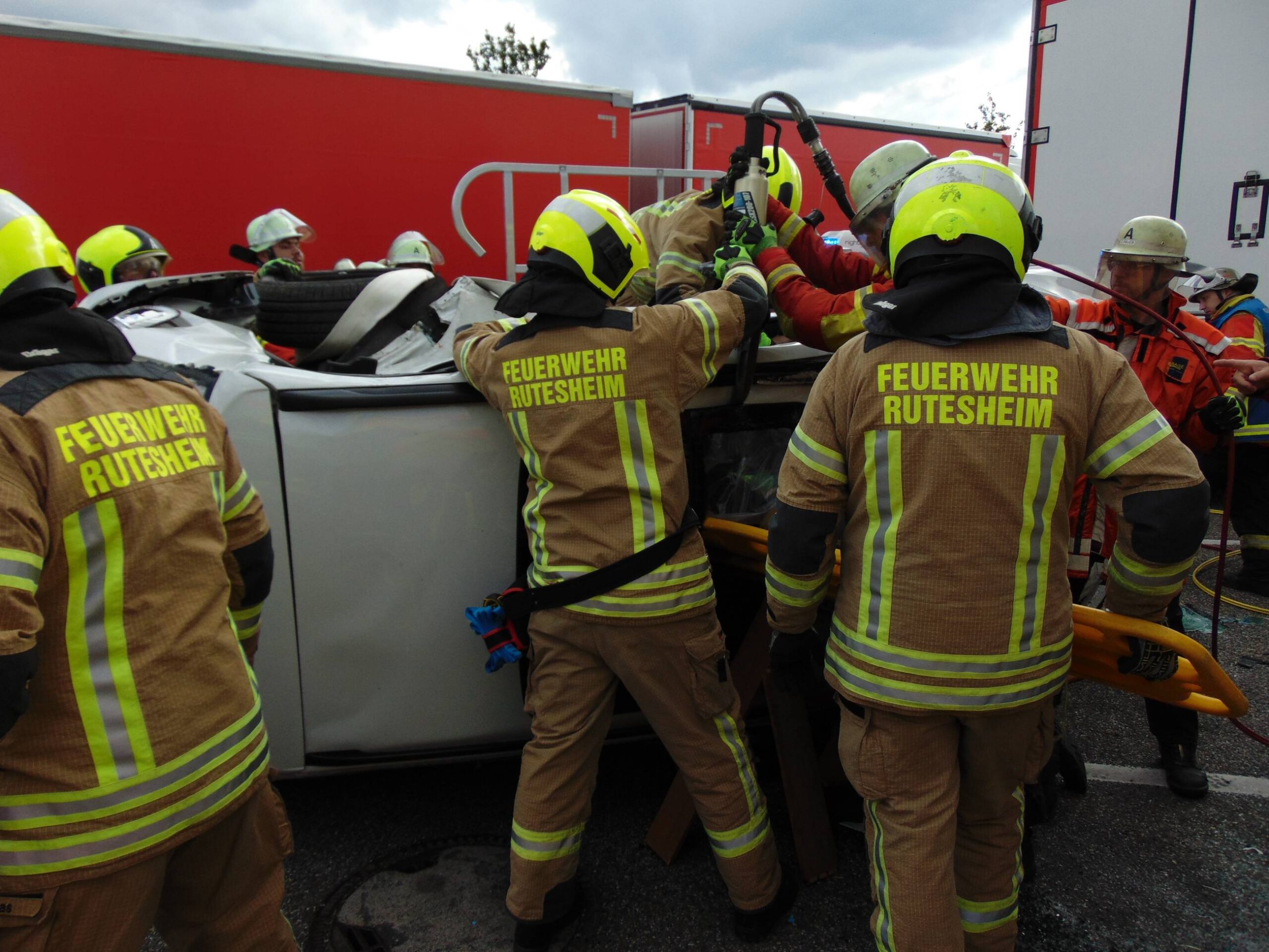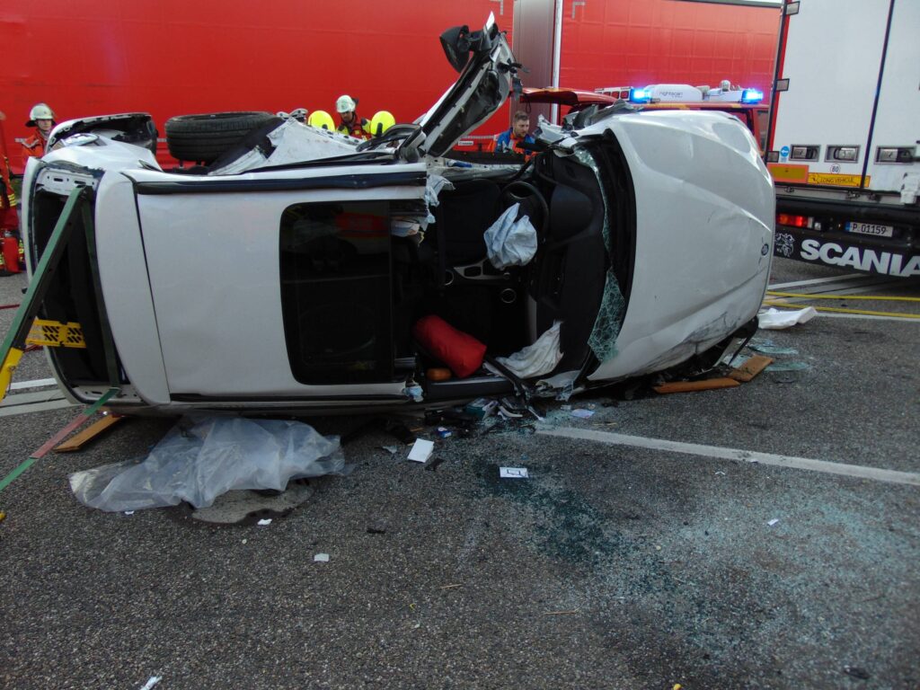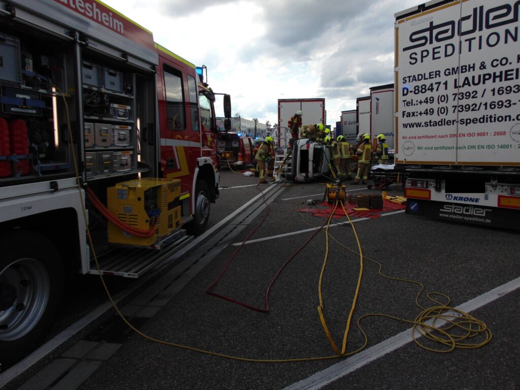 Dort kam, aus bislang ungeklärter Ursache, ein Fahrzeug beim Einfahren in den Parkplatz in den Grünbereich, überschlug sich und prallte in Folge gegen zwei Sattelzüge. Der Fahrer wurde dabei in seinem Fahrzeug eingeklemmt. Ersthelfer versuchten den Fahrer provisorisch in Seitenlage zu stabilisieren. In einem zeitaufwendigen Einsatz gelang es den Einsatzkräfte aus Rutesheim und Leonberg den Fahrer nach etwa einer Stunde zu befreien und dem Rettungsdienst zu übergeben. Die Einsatzstelle wurde zusätzlich abgesichert, der Brandschutz sichergestellt und die Batterie abgeklemmt.