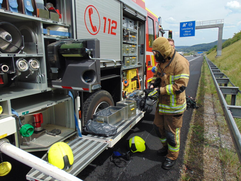 Unabhängig zur Verlastung der Trainingsanzüge auf dem Dekon-Wagen, wurden ebenfalls einige Trainingsanzüge auf unserem Hilfeleistungslöschgruppenfahrzeug HLF 20/16 verlastet. Diese bieten auch bei kleineren Einsätzen, wie beispielsweise einem PKW-Brand auf der Autobahn, die Möglichkeit zum Wechseln von kontaminierter Einsatzkleidung, ohne die explizite Anwesenheit des Gerätewagen-Transports (GW-T) an der Einsatzstelle. Befindet sich der Gerätewagen-Transport (GW-T) nicht an der Einsatzstelle, so ist ebenfalls wichtig zu gewährleisten, dass in diesem Fall alle im Einsatz befindlichen Materialien, sowie die gewechselten, kontaminierten Einsatzbekleidungen für die Rückfahrt zum Feuerwehrhaus in den Geräteräumen und nicht im Mannschaftsraum untergebracht werden. Nicht umsonst wurden unsere beiden neuen HLF 10 und HLF 20 mit jeweils sechs Atemschutzgeräten im Mannschaftsraum geplant. Dies soll vor allem eine saubere Schwarz-Weiß-Trennung gewährleisten, sowie den Atemschutzgeräteträgern einen trockenen und sauberen Vorbereitungsplatz bieten.