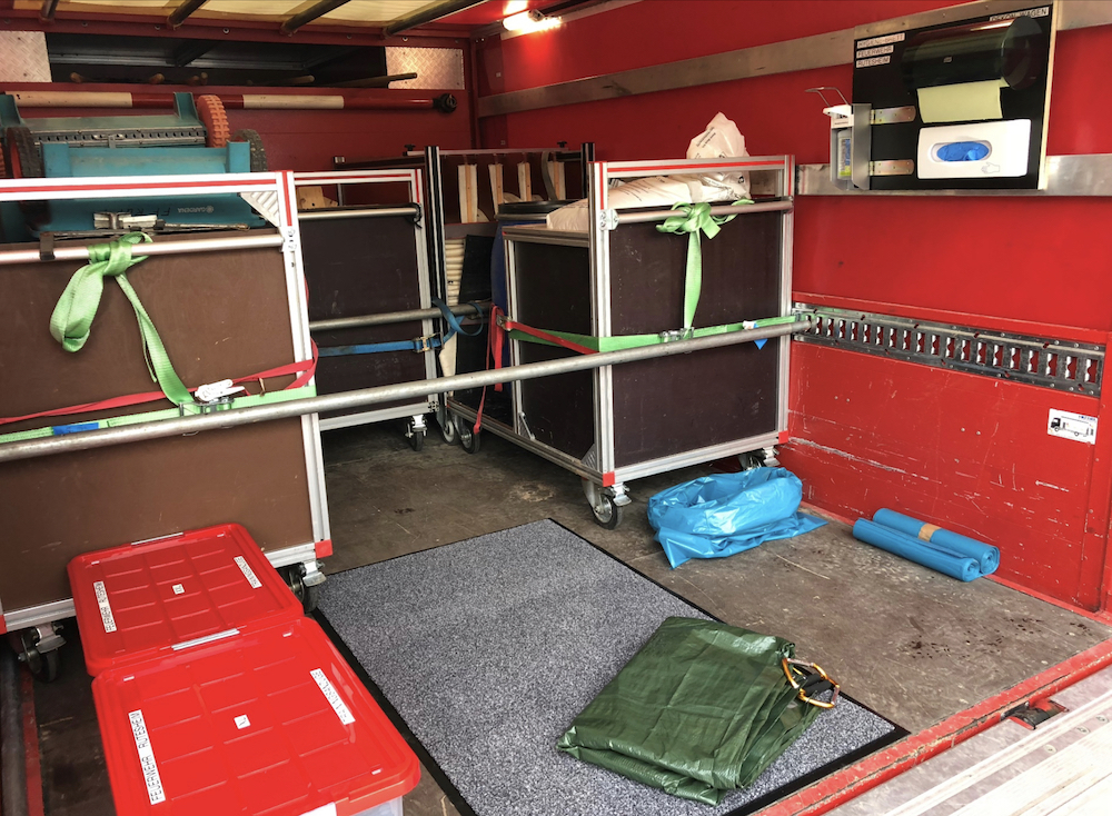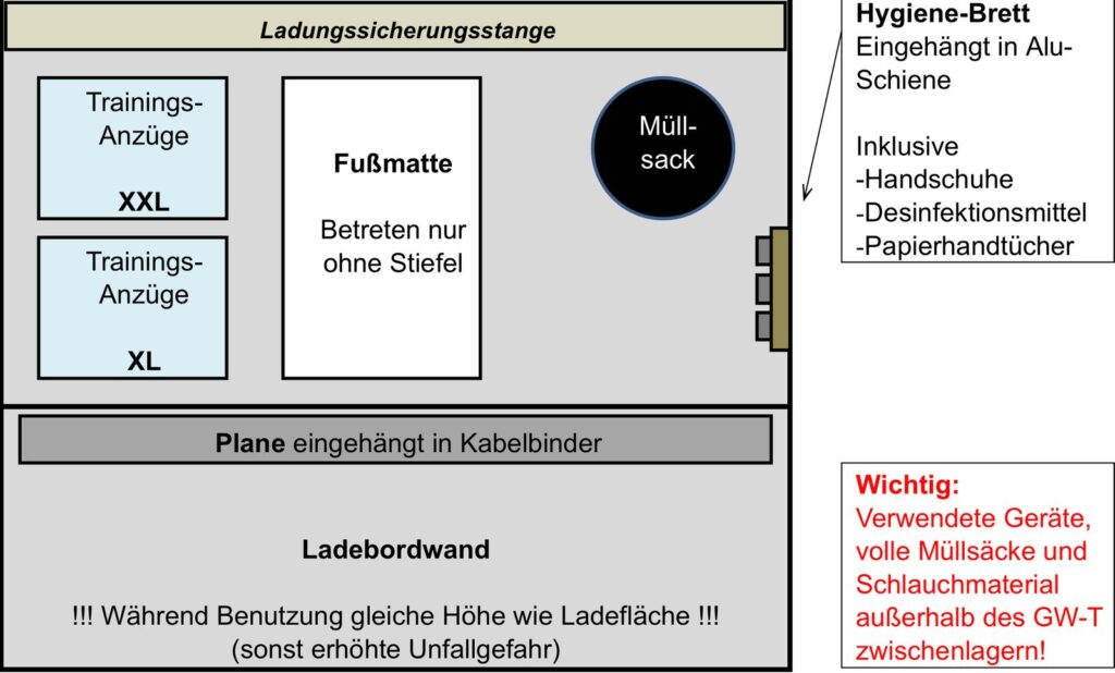 – Ein in Selbstbauweise entstandenes Hygienebrett zum Einhängen an der Ladebordwand des Gerätewagen-Transport (GW-T) mit Handdesinfektionsmittel, Einweghandschuhen, Hygienepapier und Müllsäcken